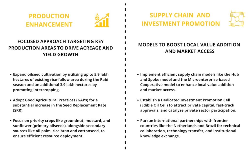 - REDUCING IMPORT DEPENDENCY: Expanding oilseed cultivation and improving yields could lead to an additional .77 million tonnes of edible oil production by 2030, helping bridge approximately 5.4% of the projected national edible oil demand-supply gap by 2030.