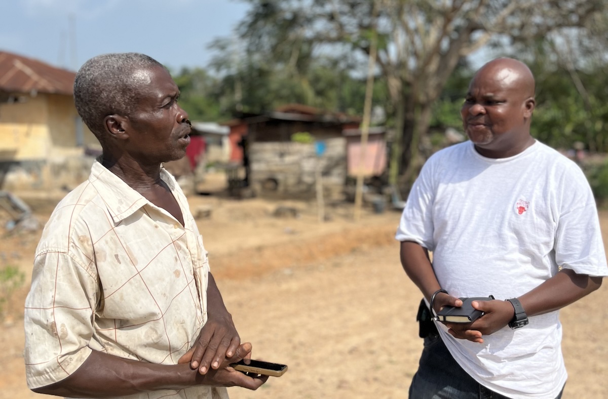 James (left) speaks with a trainer on his farm in Mfranta, Ghana.